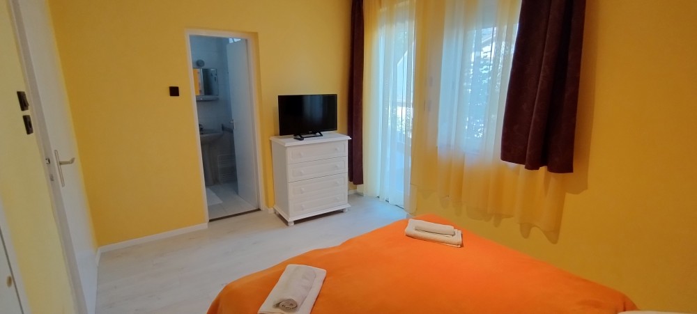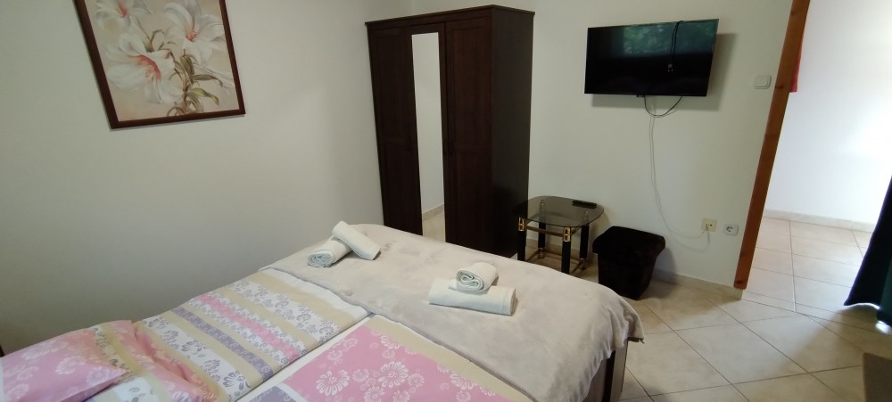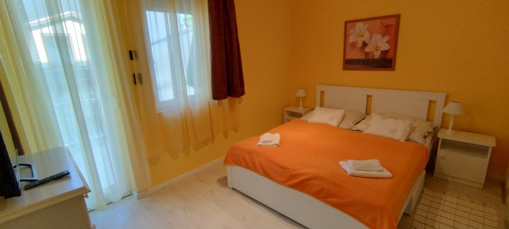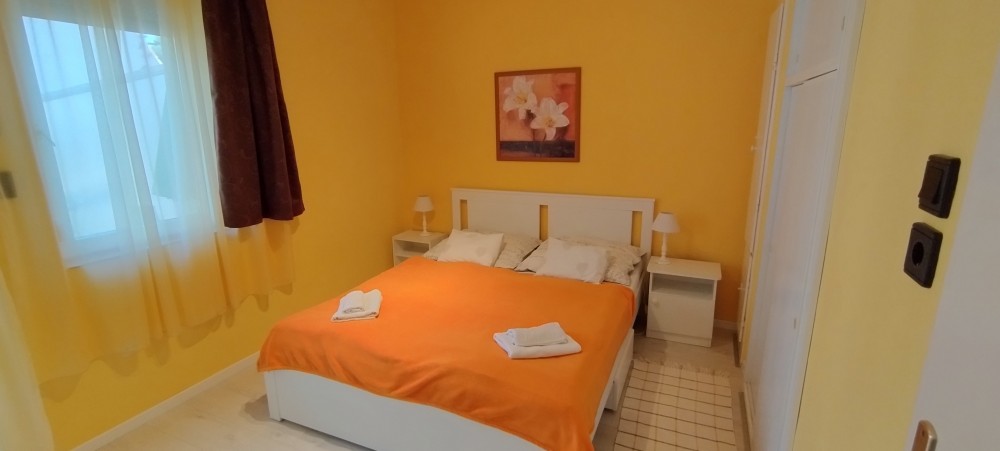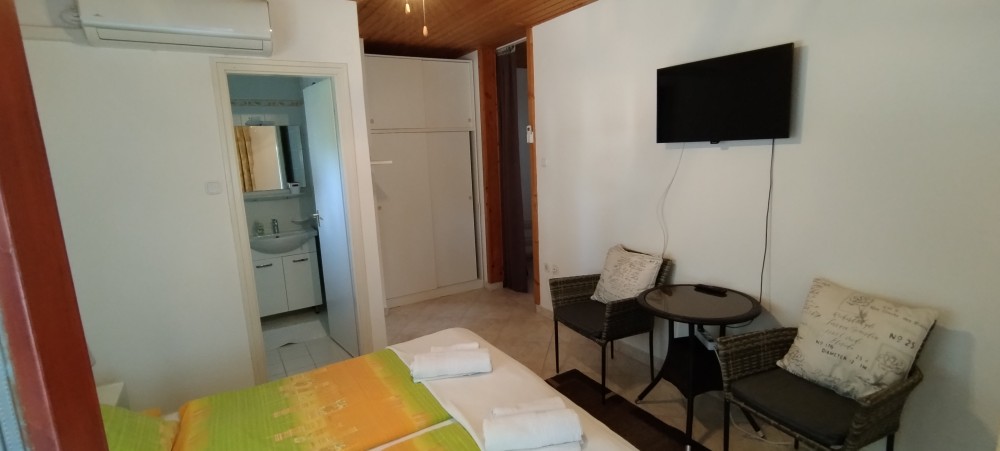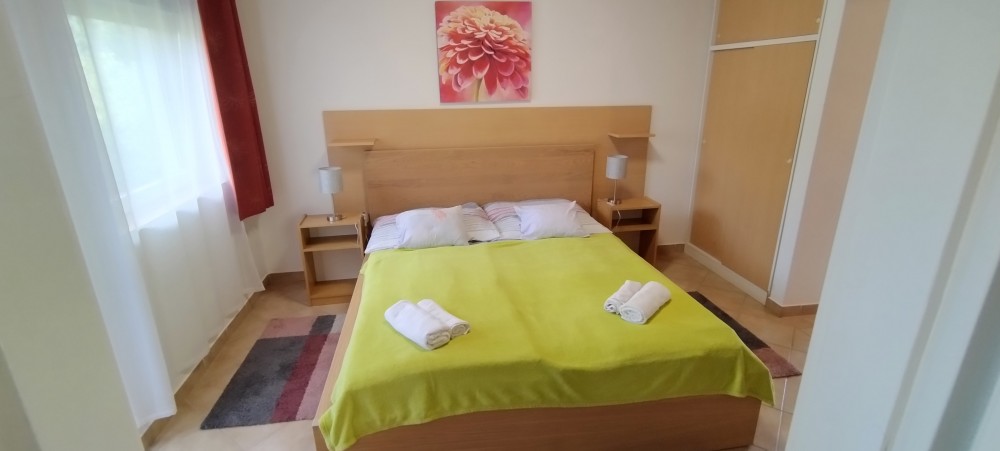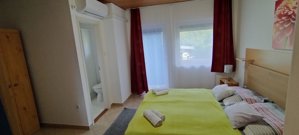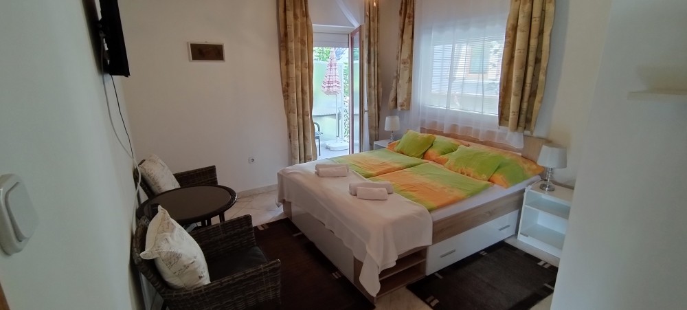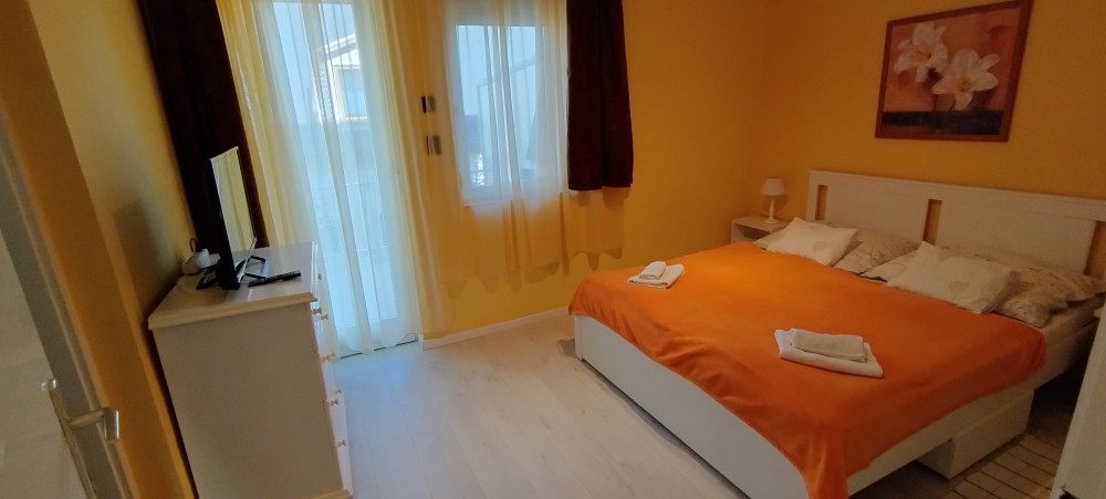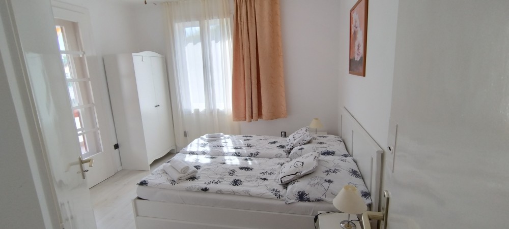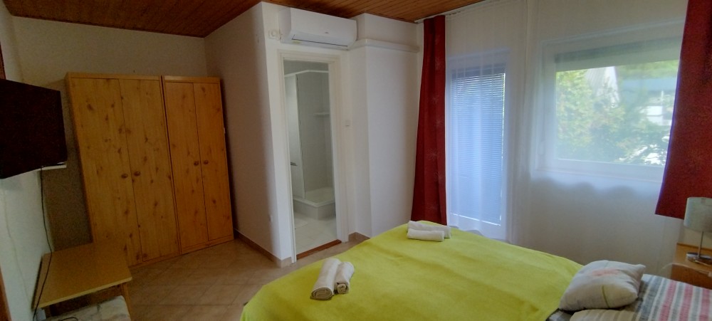 C típusú klímás apartman(4 fő) (51-65. képek): 3 szobás apartman a második emeleten nagy panorámaterasszal: 2 hálószoba, mindegyik saját franciaággyal és saját légkondícionálóval, fürdőszoba/WC, felszerelt konyha (kávéfőző, toast sütő, mikró, vízforraló stb.), nappali ülőgarnitúrával, étkezősarok, nagy LCD TV, nagy terasz kerti bútorokkal.