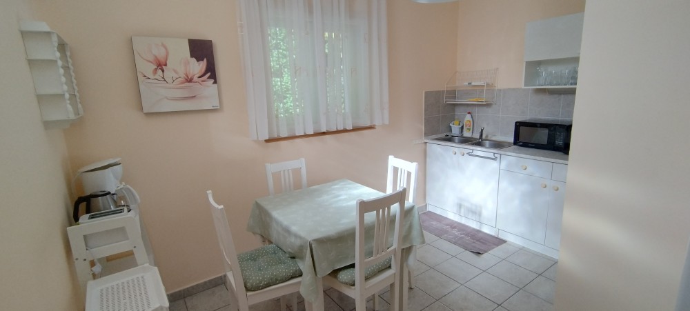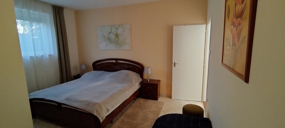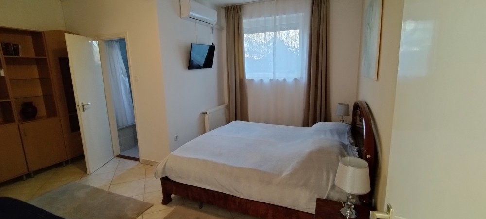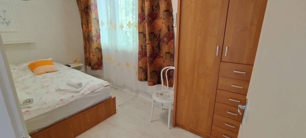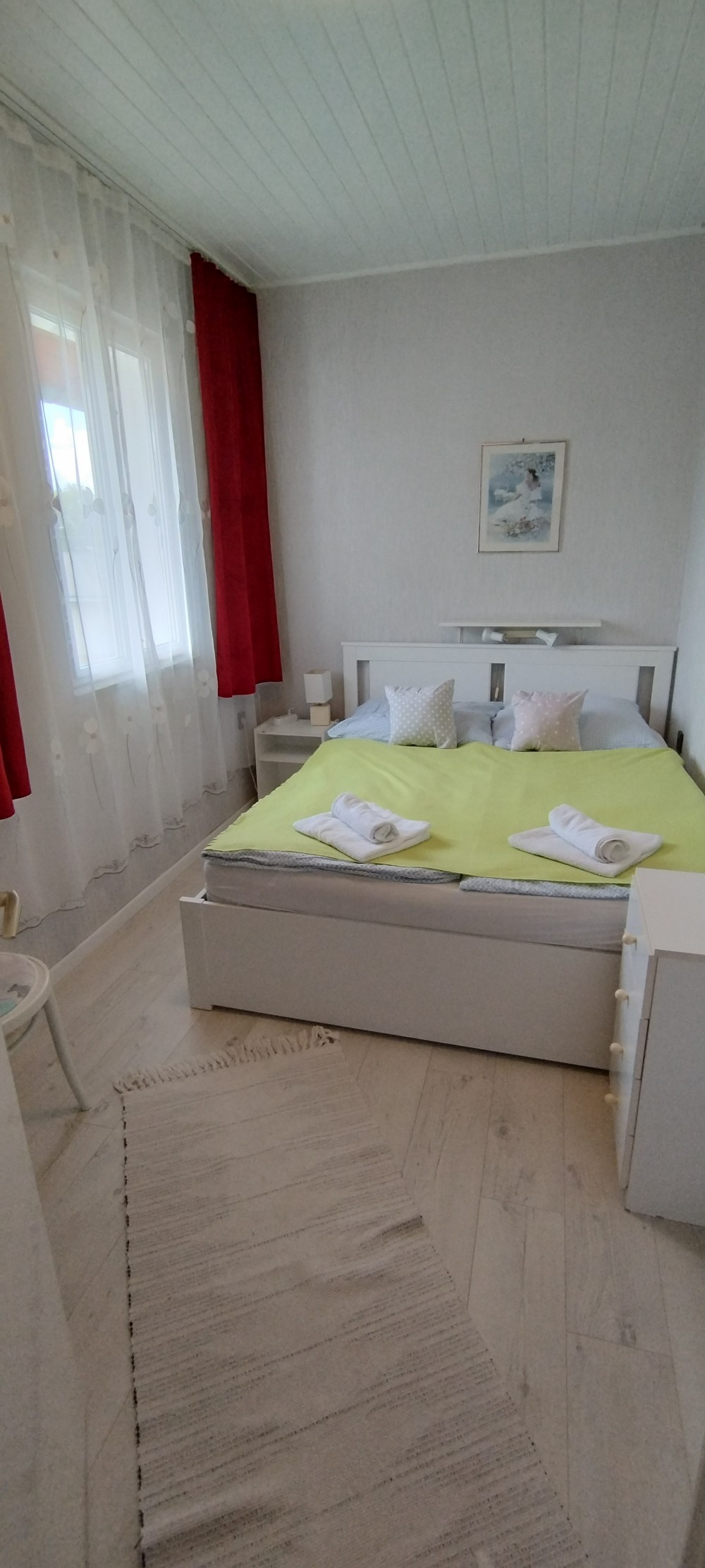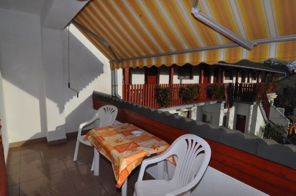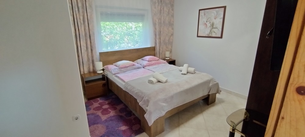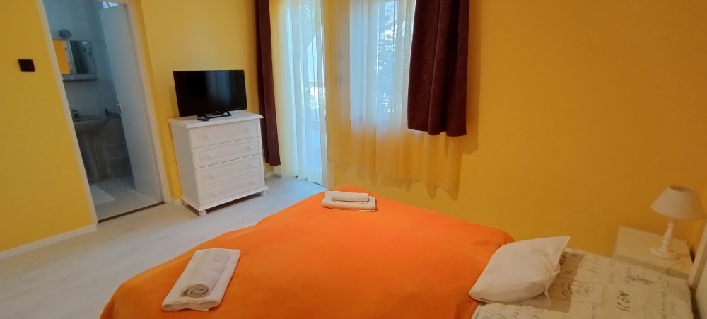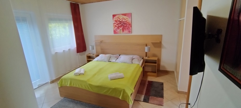 C típusú klímás apartman(4 fő) (51-65. képek): 3 szobás apartman a második emeleten nagy panorámaterasszal: 2 hálószoba, mindegyik saját franciaággyal és saját légkondícionálóval, fürdőszoba/WC, felszerelt konyha (kávéfőző, toast sütő, mikró, vízforraló stb.), nappali ülőgarnitúrával, étkezősarok, nagy LCD TV, nagy terasz kerti bútorokkal.