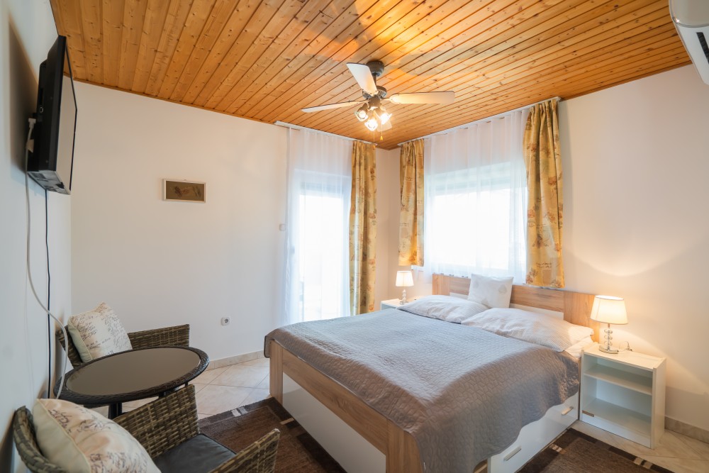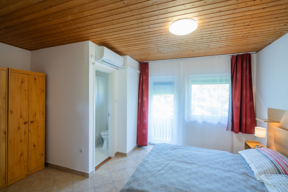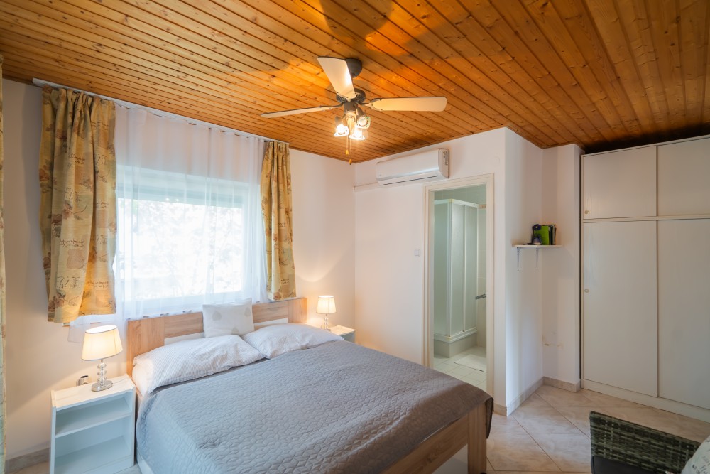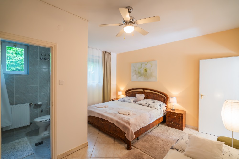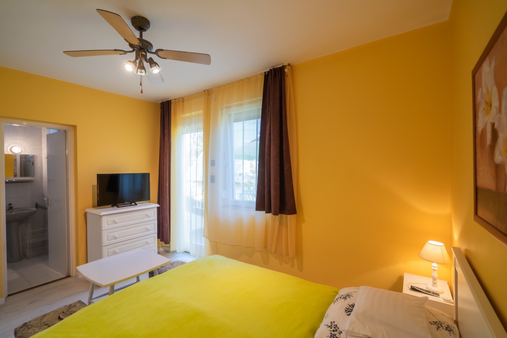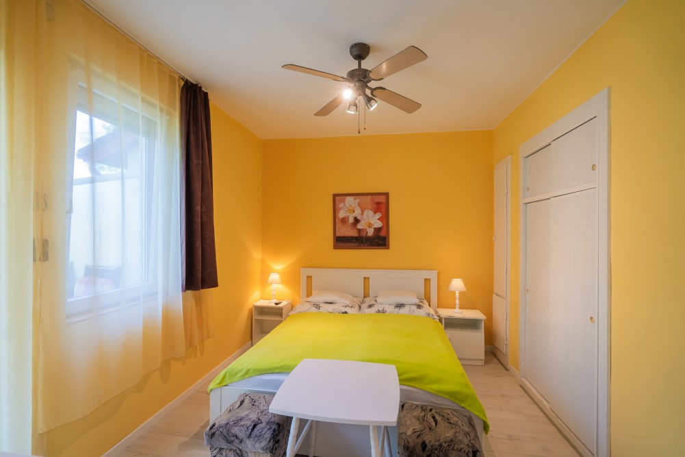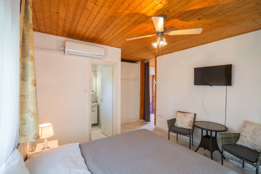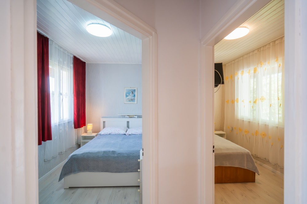 B típusú klímás apartman (4 fő) (40-60. képek): 2 szobával az első emeleten: 2 hálószoba mindkettő franciaággyal és mindkettő saját fürdőszoba/WC-vel, saját TV-vel, felszerelt konyha (kávéfőző, toast sütő, mikró, vízforraló stb.), mindkét szoba önálló terasszal. Mennyezetventillátorok mindkét szobában.
