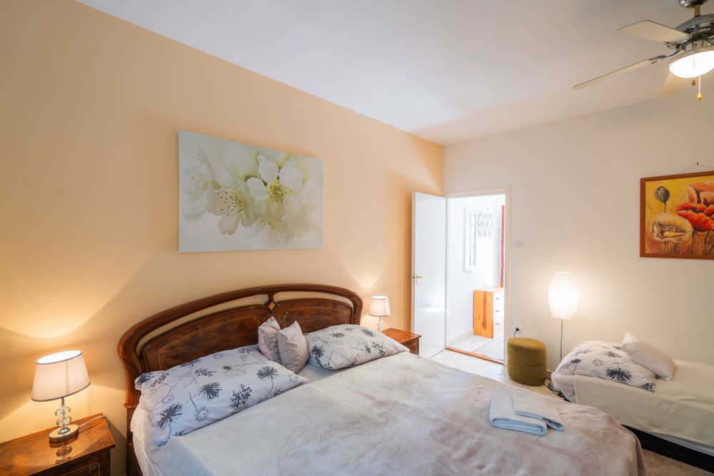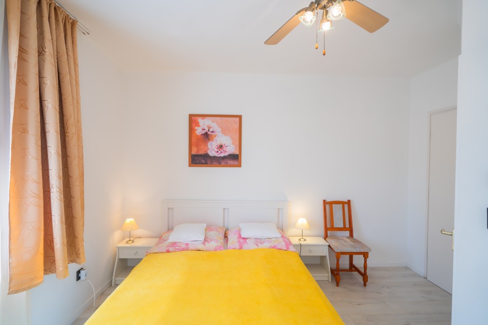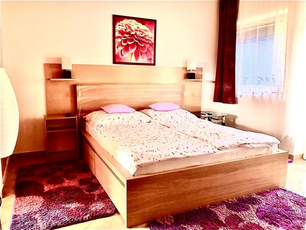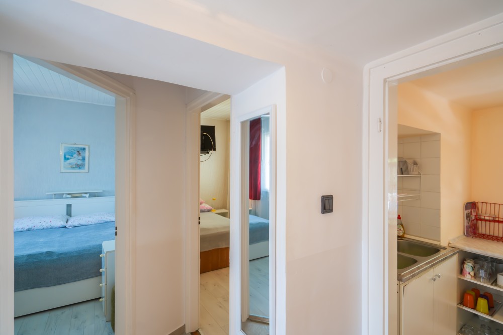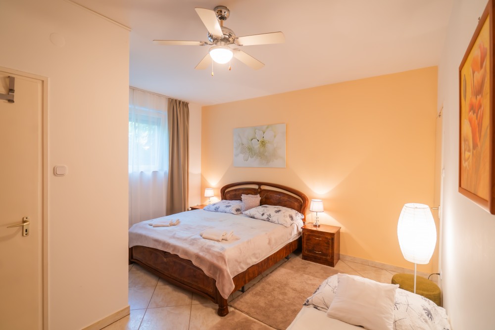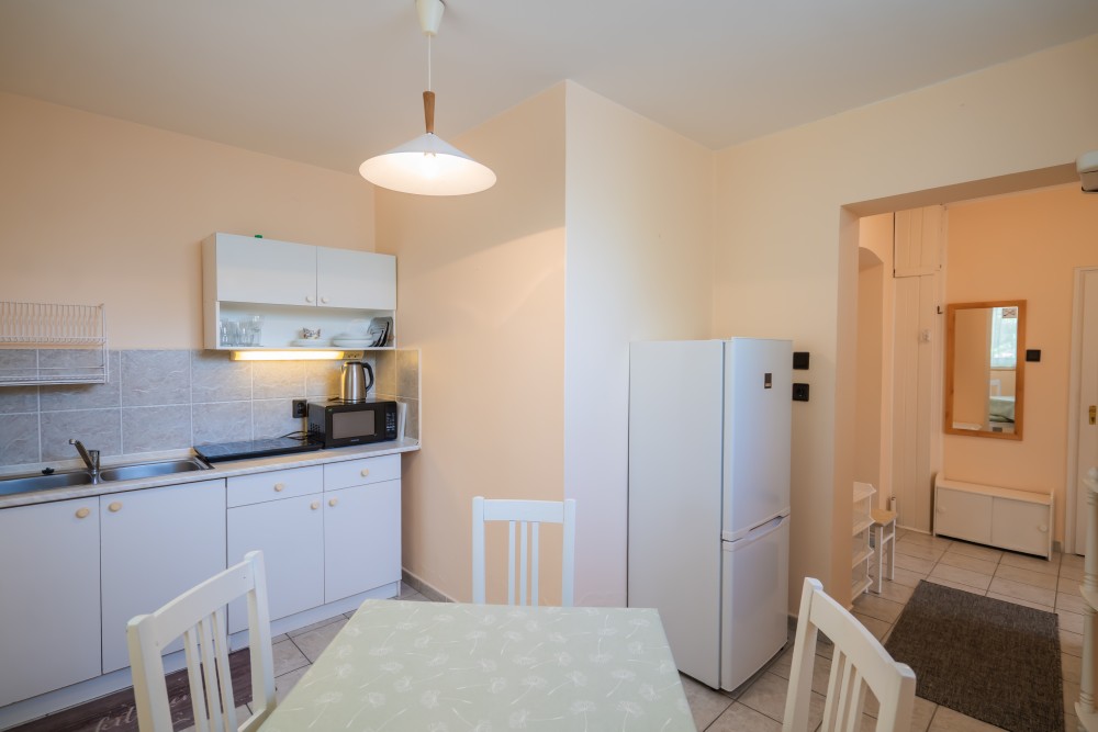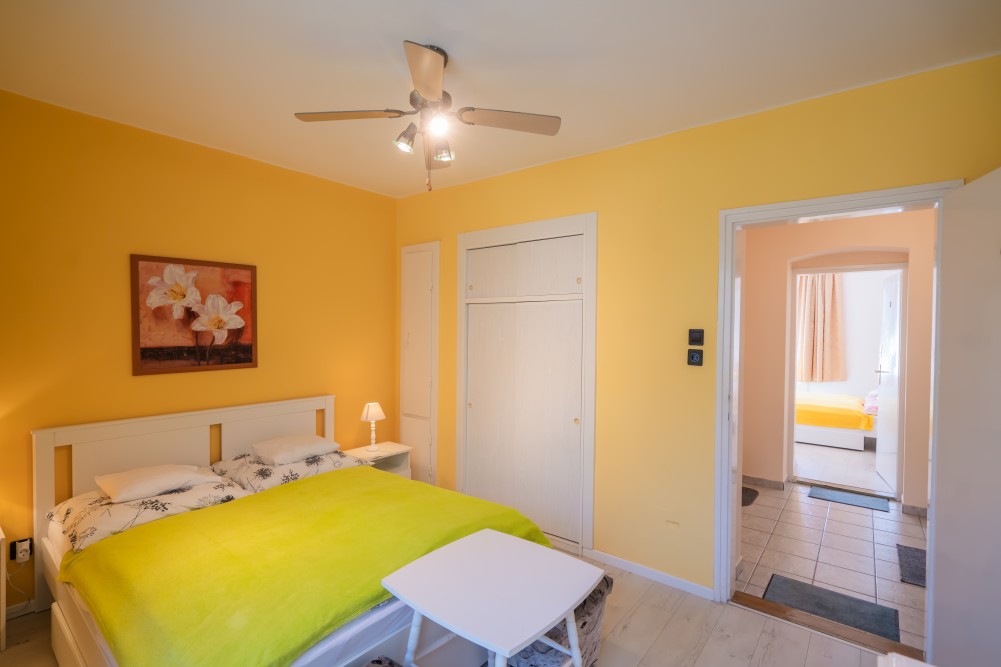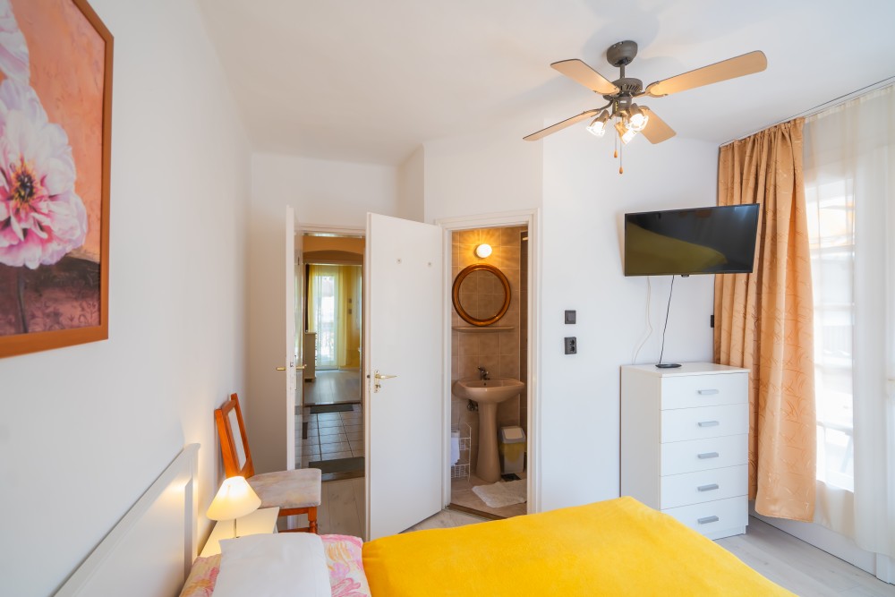 B típusú klímás apartman (4 fő) (40-60. képek): 2 szobával az első emeleten: 2 hálószoba mindkettő franciaággyal és mindkettő saját fürdőszoba/WC-vel, saját TV-vel, felszerelt konyha (kávéfőző, toast sütő, mikró, vízforraló stb.), mindkét szoba önálló terasszal. Mennyezetventillátorok mindkét szobában.