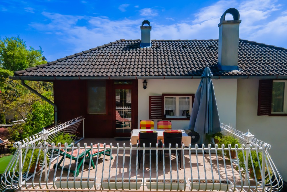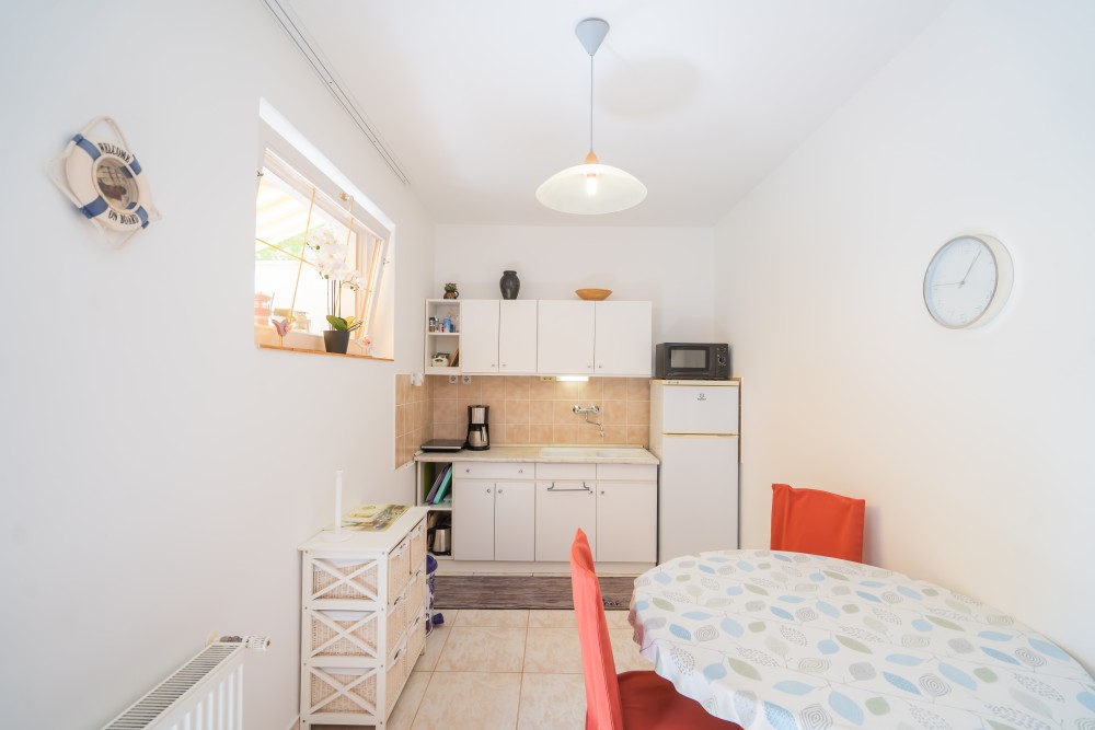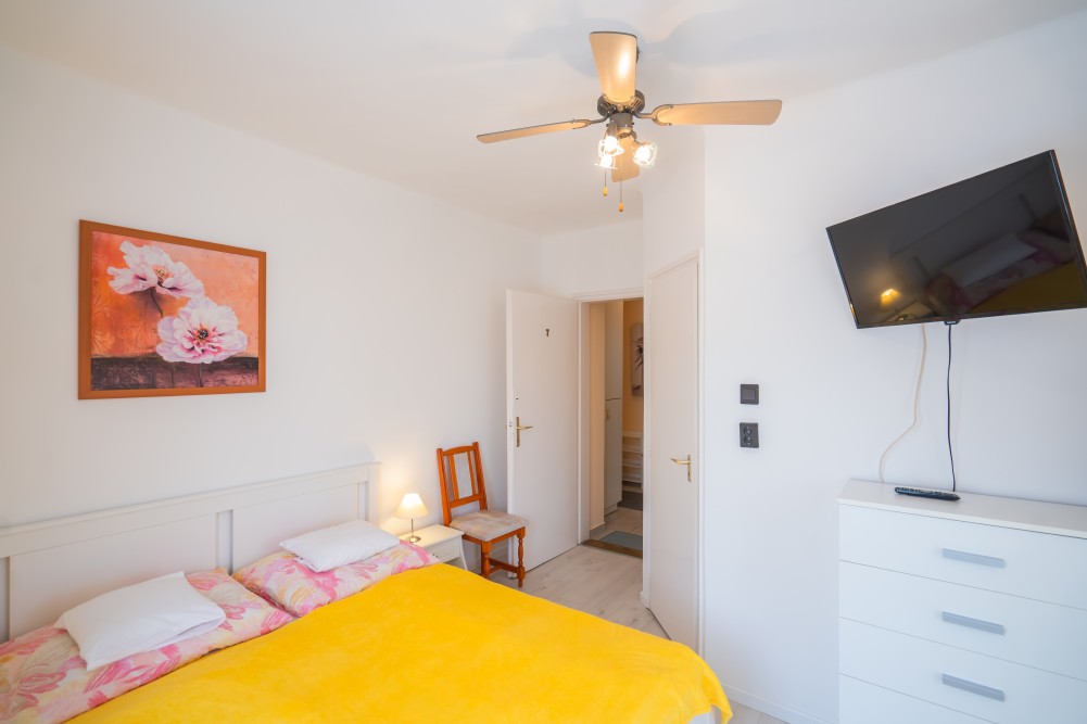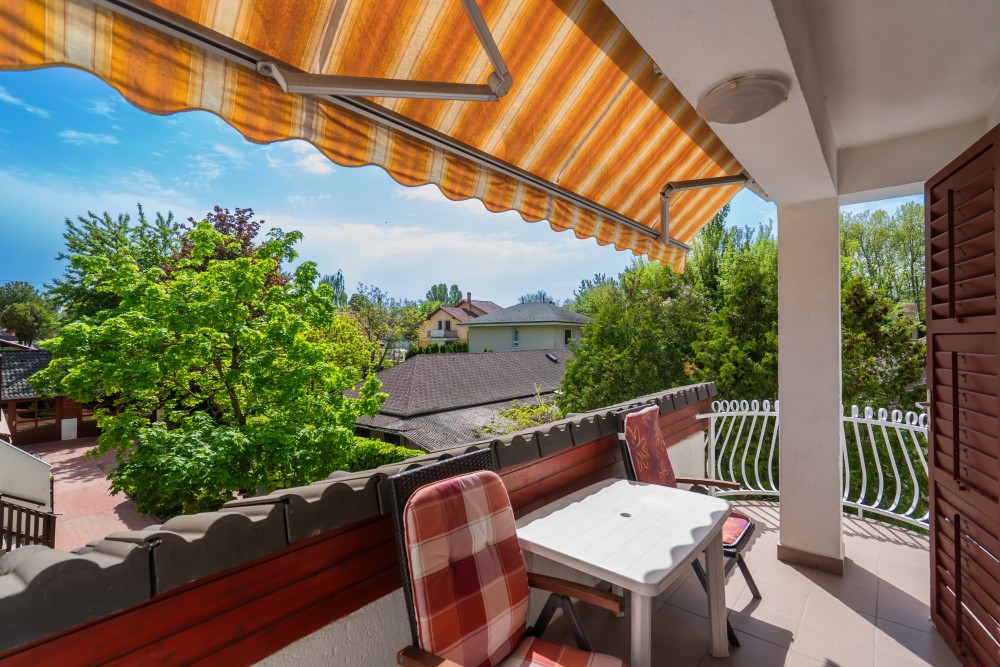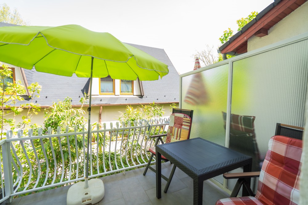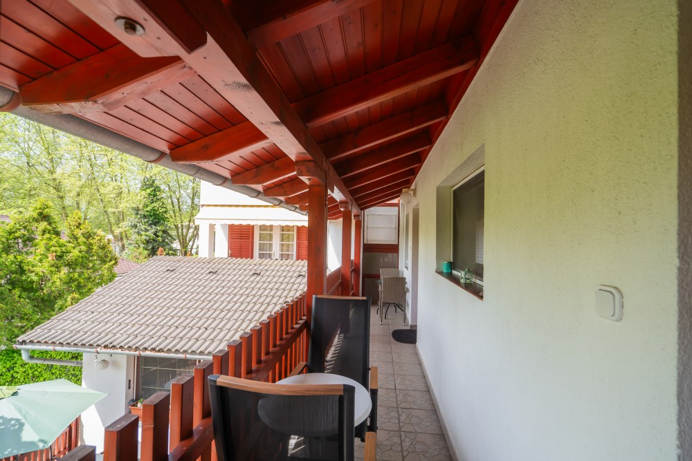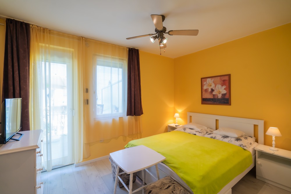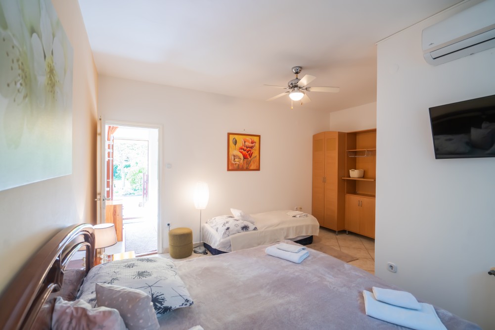B típusú klímás apartman (4 fő) (40-60. képek): 2 szobával az első emeleten: 2 hálószoba mindkettő franciaággyal és mindkettő saját fürdőszoba/WC-vel, saját TV-vel, felszerelt konyha (kávéfőző, toast sütő, mikró, vízforraló stb.), mindkét szoba önálló terasszal. Mennyezetventillátorok mindkét szobában.