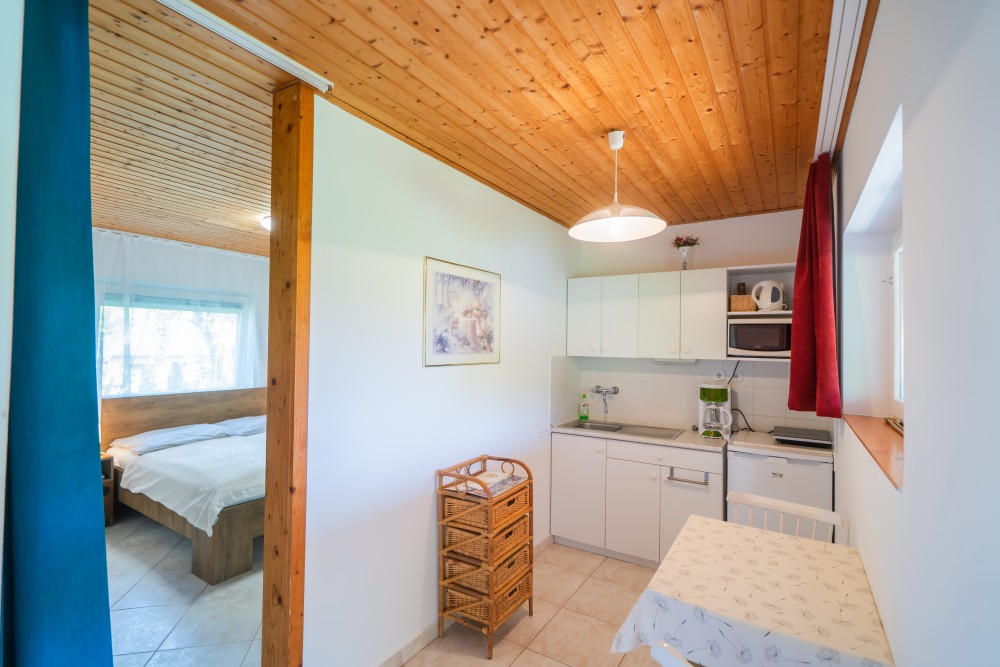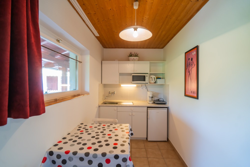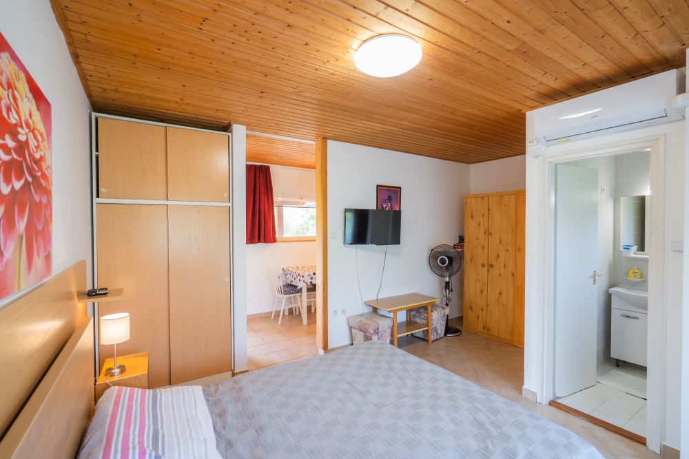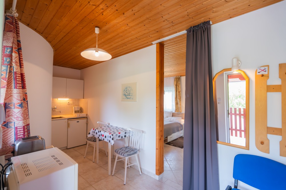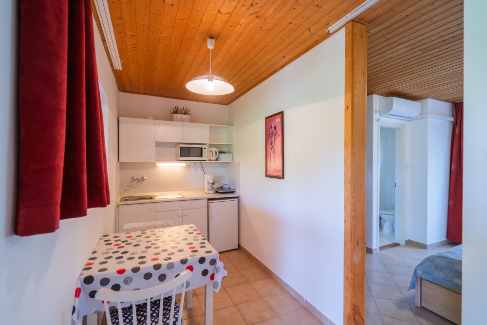 A típusú klímás apartman (2 fő vagy 2+1 fő) (2-39. képek): hálószoba franciaággyal (egyes ilyen apartmanokban kinyitható pótágy), fürdőszoba/WC, LCD TV, felszerelt étkezőkonyha (kávéfőző, toast sütő, mikró, vízforraló stb.), balkon.