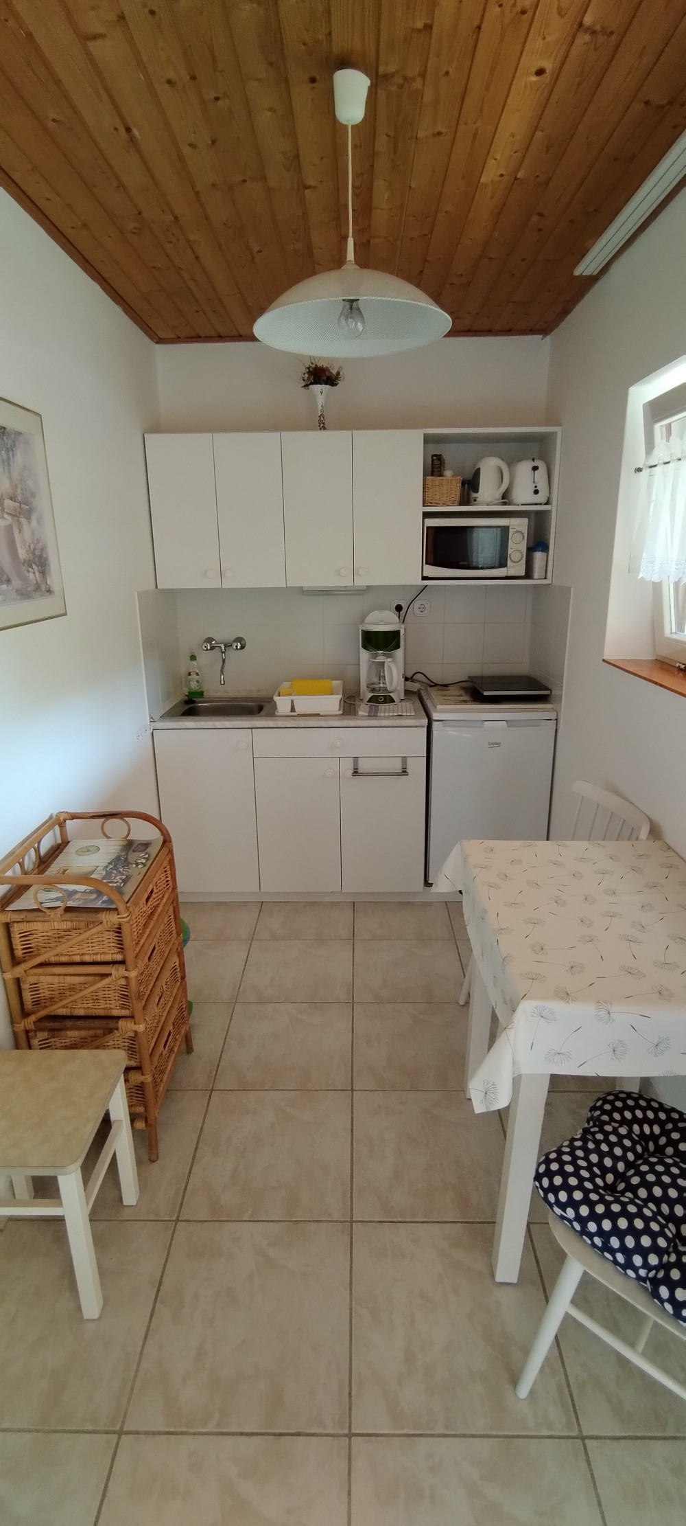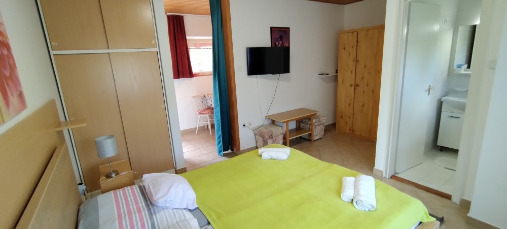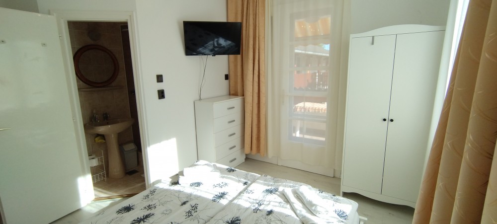 B típusú klímás apartman (4 fő) (36-50. képek): 2 szobával az első emeleten: 2 hálószoba mindkettő franciaággyal és mindkettő saját fürdőszoba/WC-vel, saját TV-vel, felszerelt konyha (kávéfőző, toast sütő, mikró, vízforraló stb.), mindkét szoba önálló terasszal. Mennyezetventillátorok mindkét szobában.