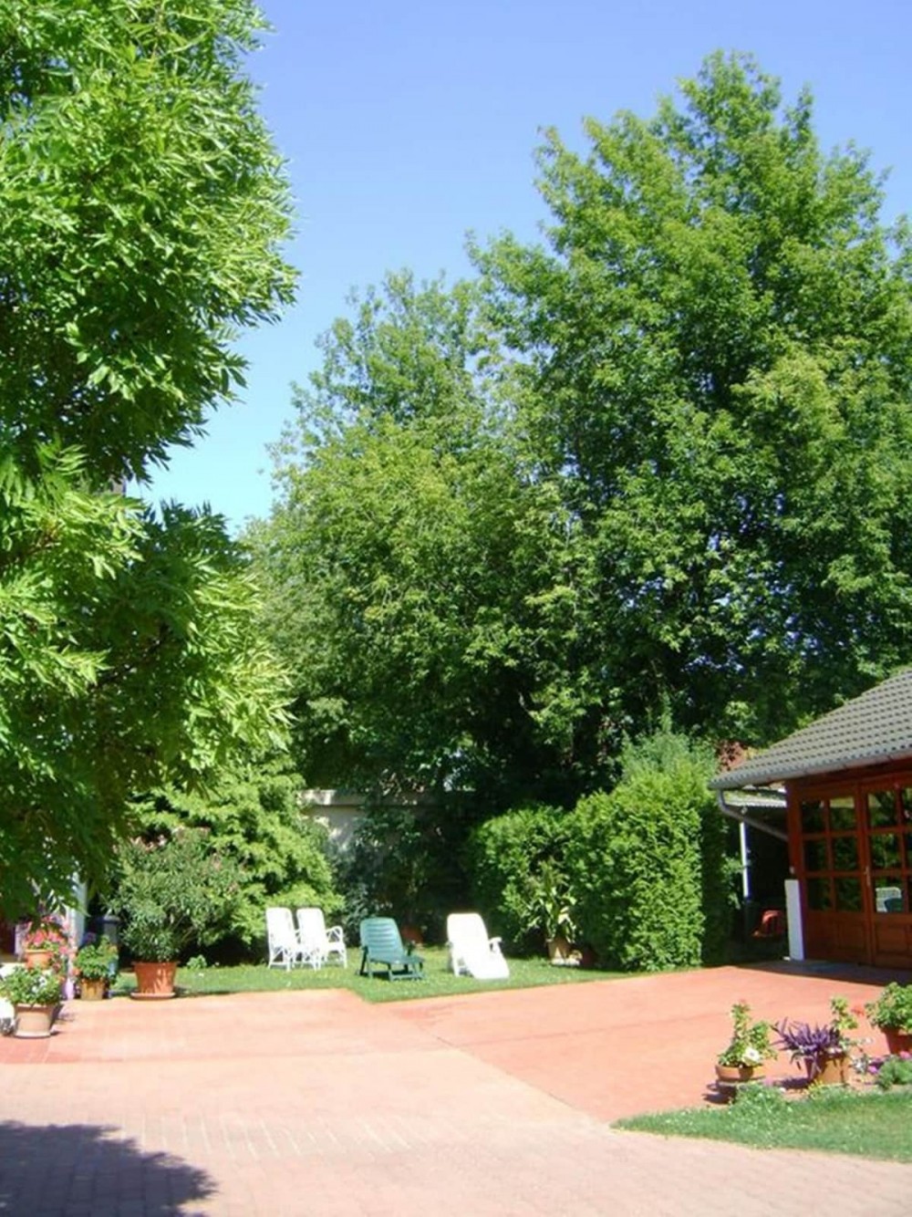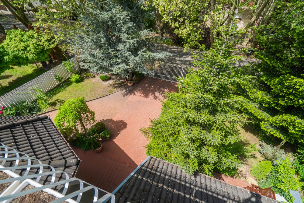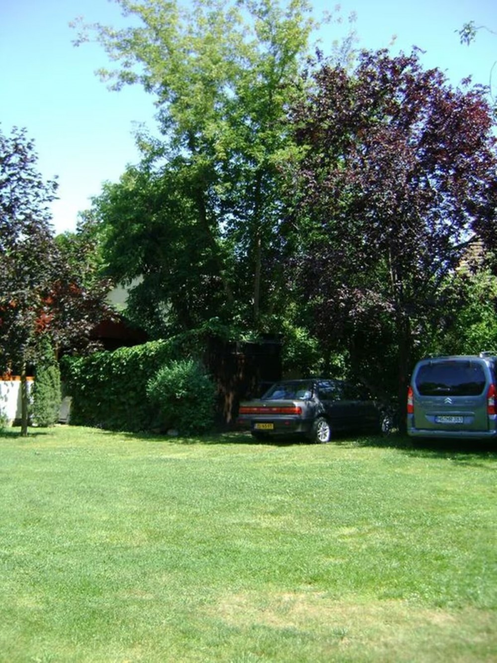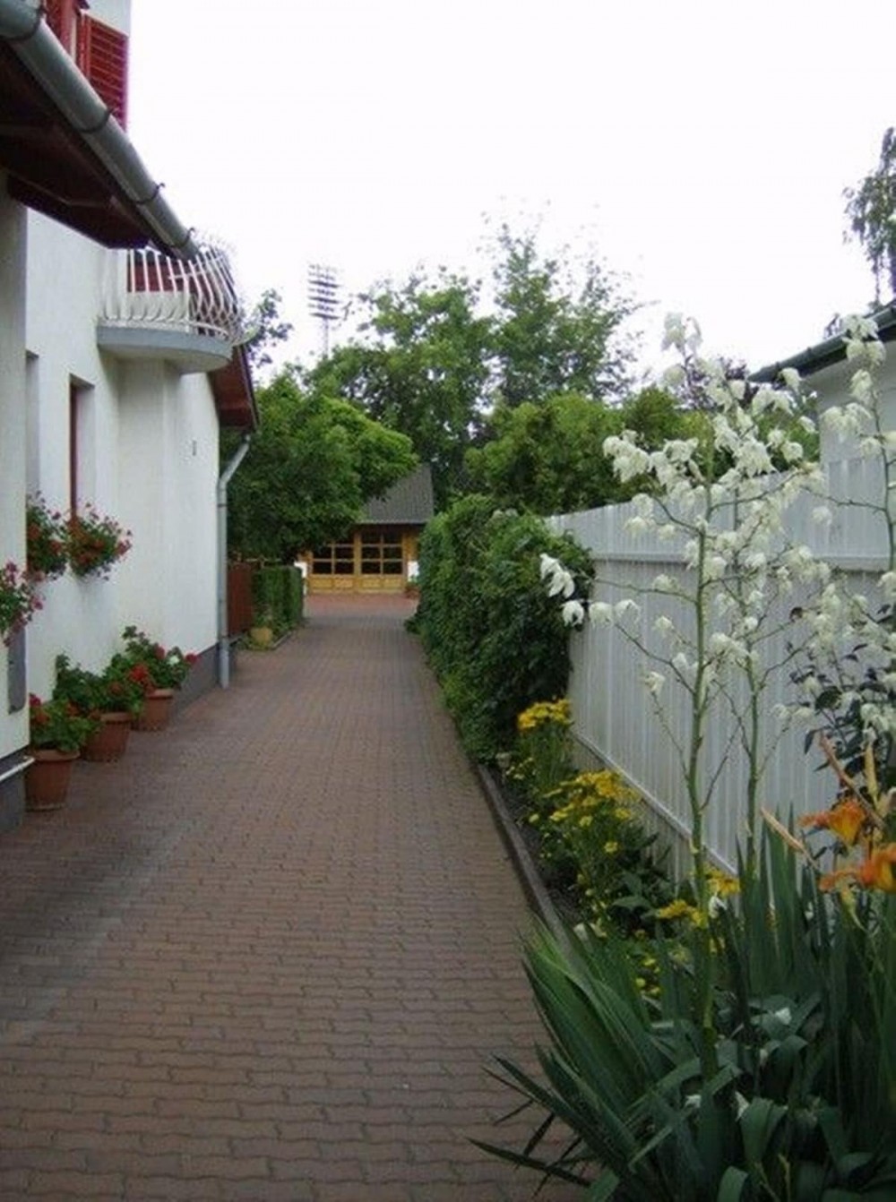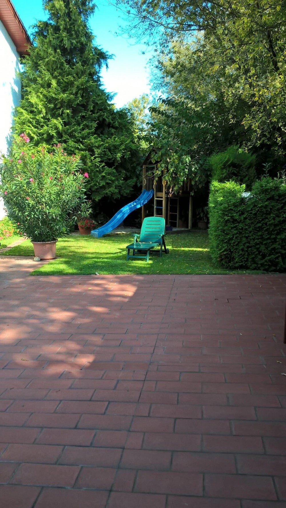 Parkolás a zárt udvarban. Kerti bútorok, napozóágyak, kerti ház, grill, homokozó, hintaágy, játszóvár, csúszda.