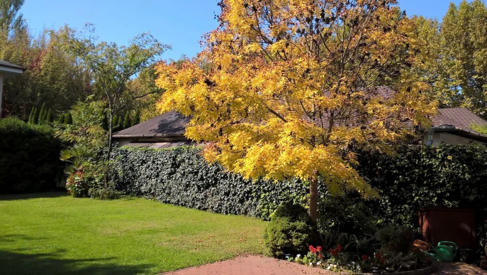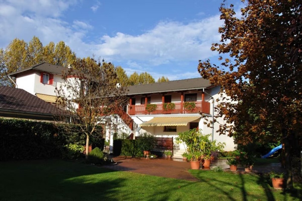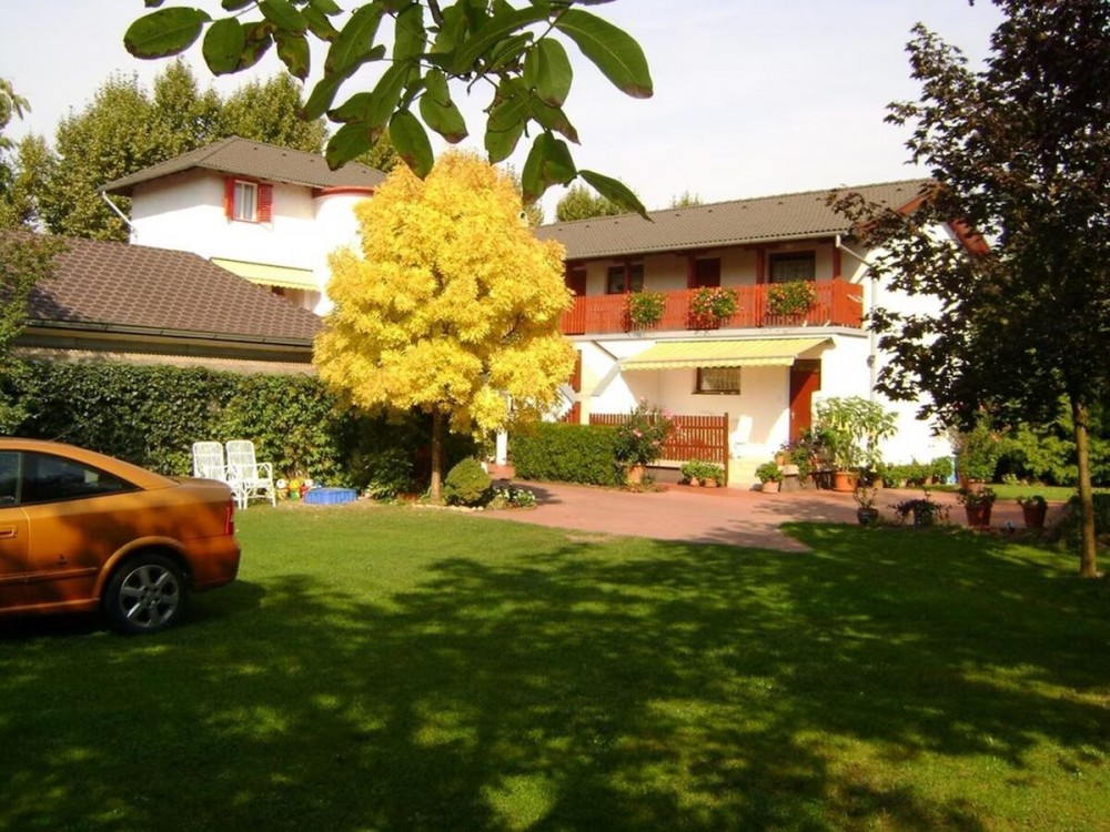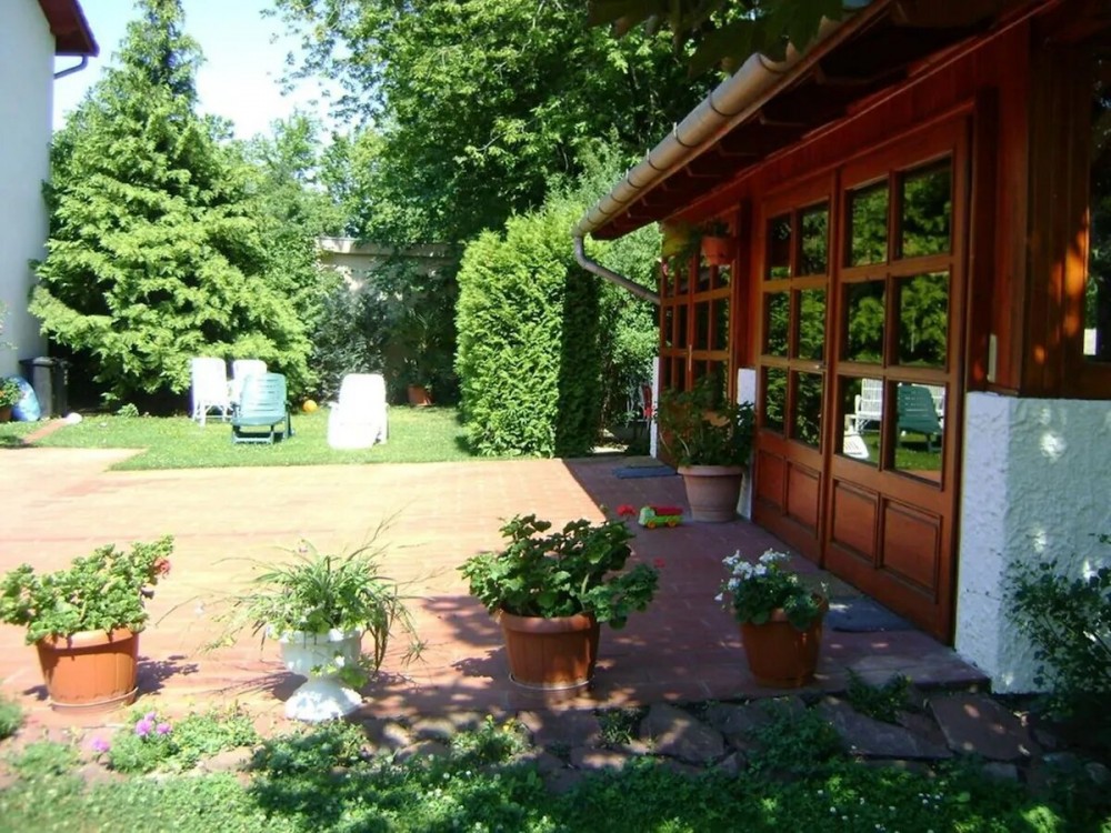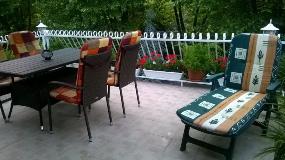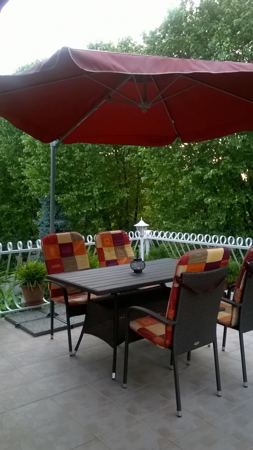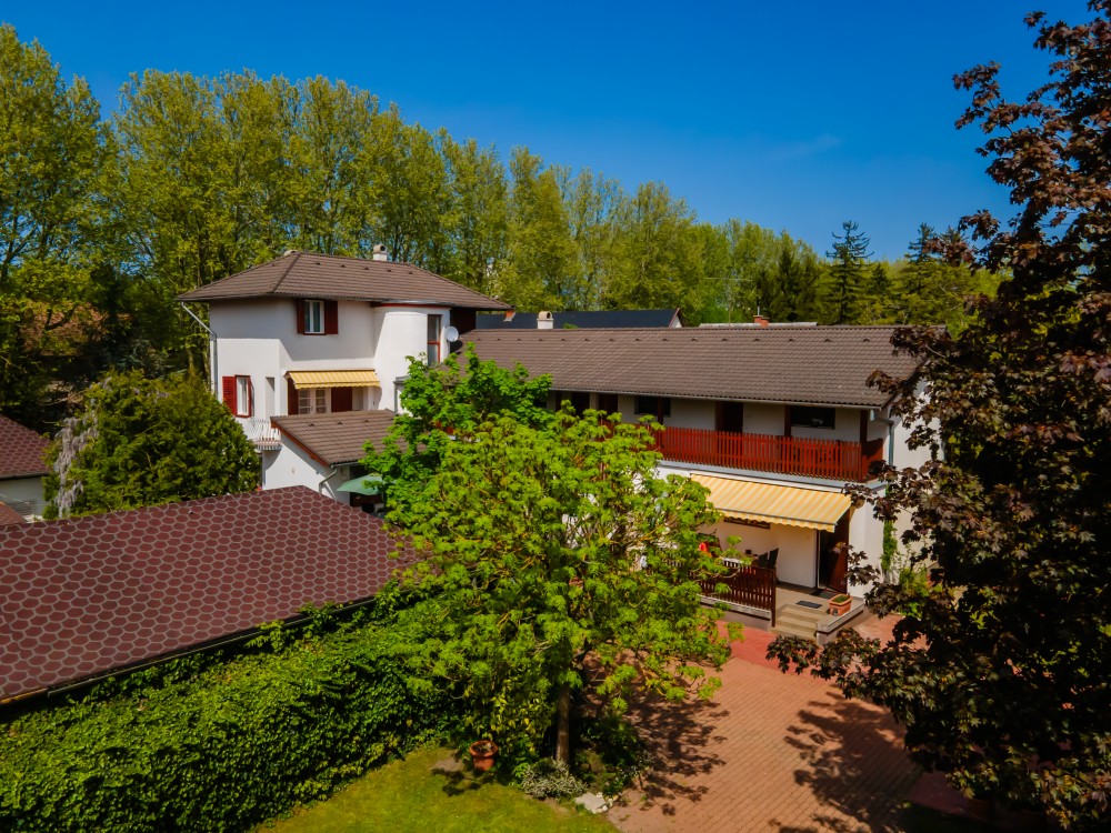 Parkolás a zárt udvarban. Kerti bútorok, napozóágyak, kerti ház, grill, homokozó, hintaágy, játszóvár, csúszda.