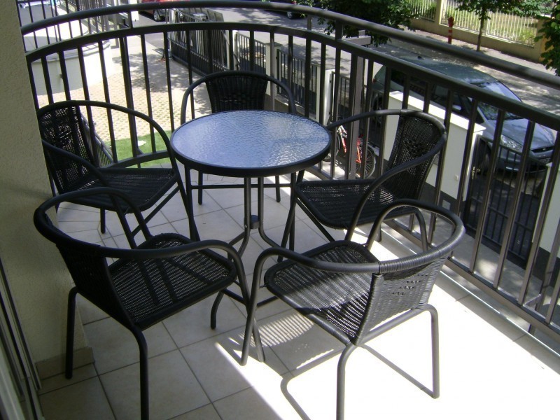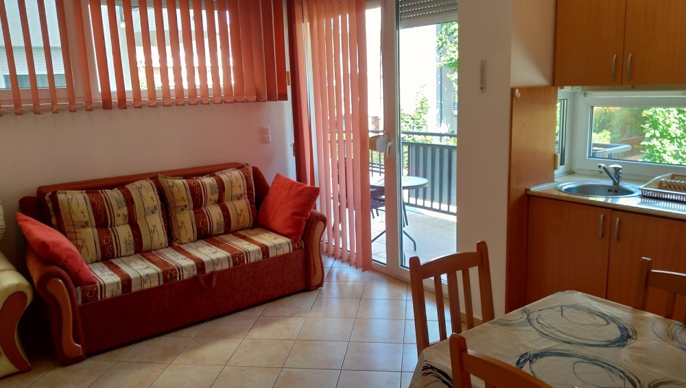 Siófokon a Nagystrandnál (Plazs) modern, klímás apartman, 2 hálószobával, teljesen felszerelt amerikai konyha(kávéfőző, piritóssűtő, villanytűzhely, mélyhűtős hűtő, mikró, edények, poharak, tányérok, evőeszközök, stb.), nappali LCD TV-vel és kinyitható ülőgarnitúrával(+2 fő részére), étkezőasztal, fürdőszoba/WC, terasz kerti bútorral, mosógép.